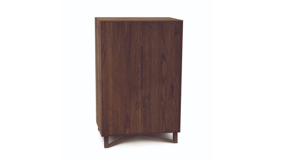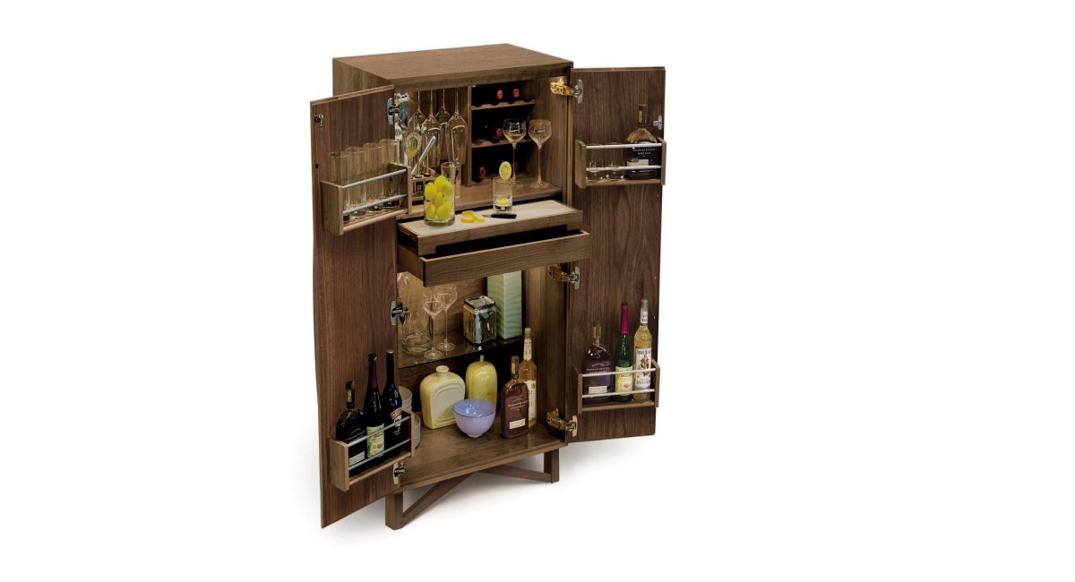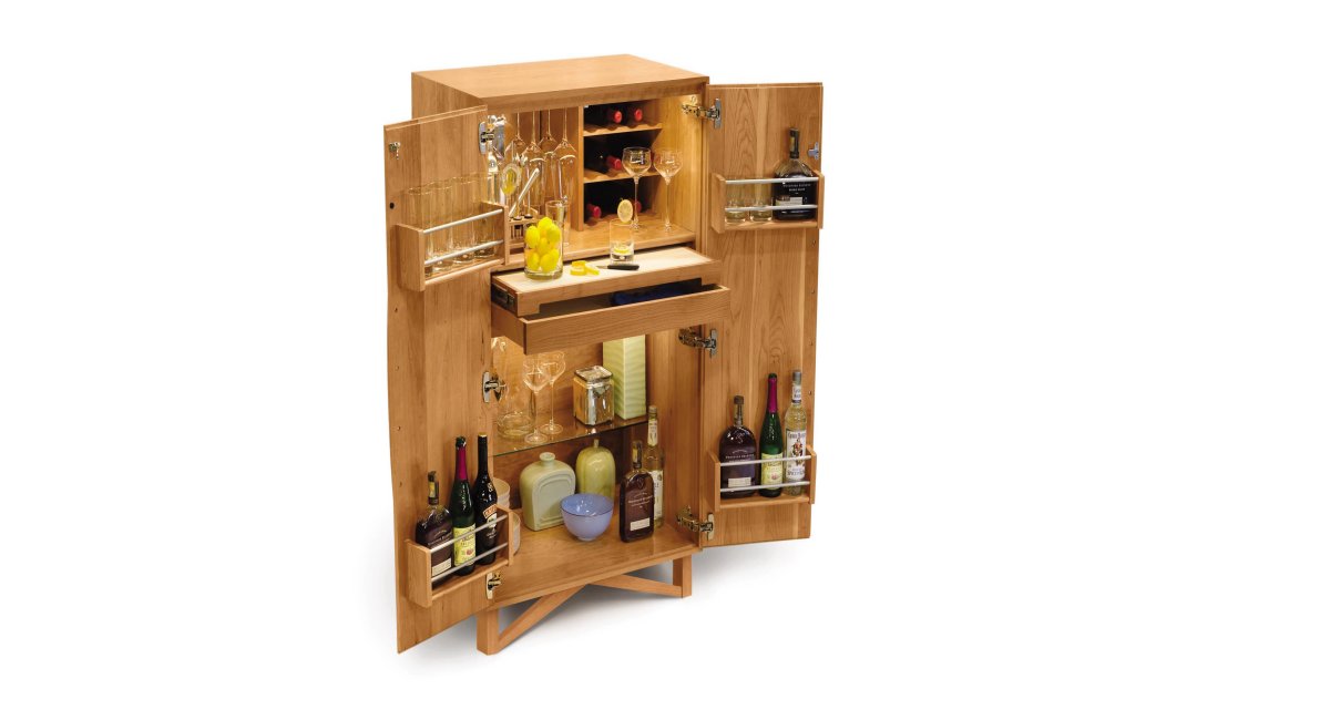 The Copeland Exeter Bar is crafted in solid cherry hardwood and made to Order in several finishes. The Exeter Bar includes Wine bottle storage, LED interior lighting, a Pullout acrylic work surface, and a soft-close storage tray. The Exeter Bar is also crafted in solid American Black Walnut. The Copeland Exeter Bar can be ordered with an optional lock.