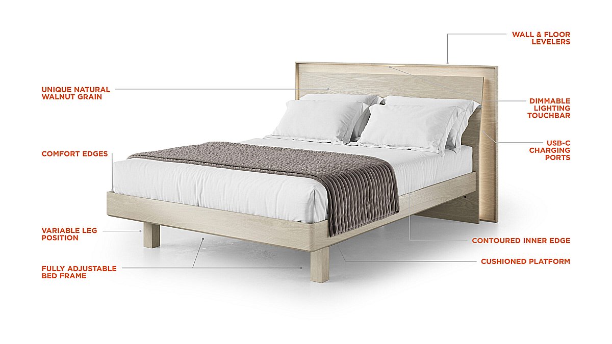 The BDI 9117 KAVA Queen Bed balances geometric design with modern convenience, featuring built-in charging, dimmable lighting, and an adjustable-height frame for a seamless blend of style and function. Available in washed oak, and natural walnut.