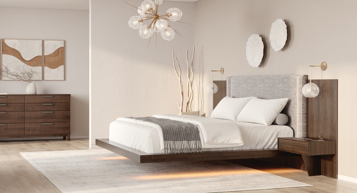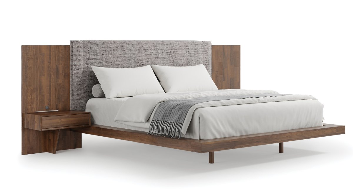 Crafted with exceptional care from solid American finger-jointed black walnut, the Savoy Bed showcases a beautiful natural finish that highlights the wood’s rich grain. To make it uniquely yours, the headboard is available in a wide selection of materials, including luxurious microsuedes, fine fabrics, Ultrasuede®, and Ultraleather®. We also welcome customers to provide their own material (COM) for a truly personalized touch.