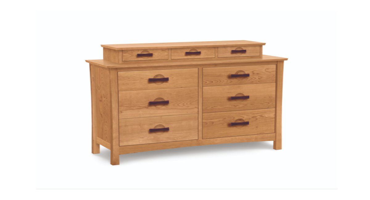 The Copeland Berkeley 6 Drawer Dresser in Cherry. Crafted from Solid Cherry Hardwood with American Black Walnut accents. Plus, the Dresser is Made to Order in a variety of finishes and with different pull options. The Berkeley Dresser feature soft-close, self close drawer glides. The Berkeley Dresser goes perfectly with its matching Bed, and case pieces. The Berkely also offers an accessory tray that sits on top of the Dresser.