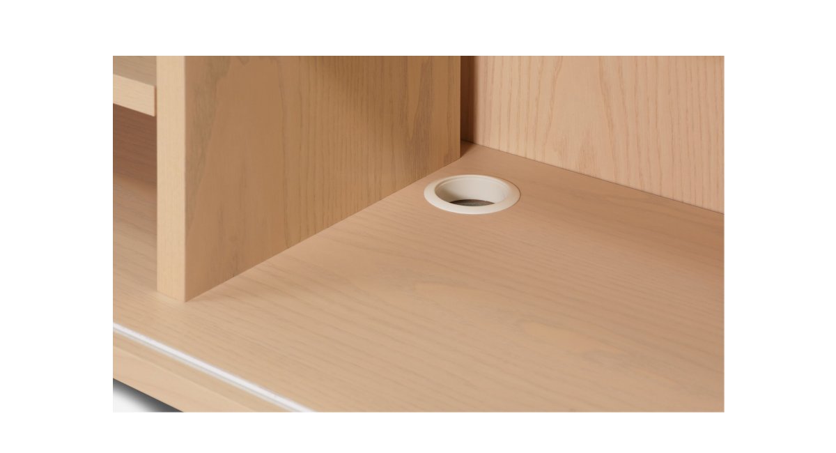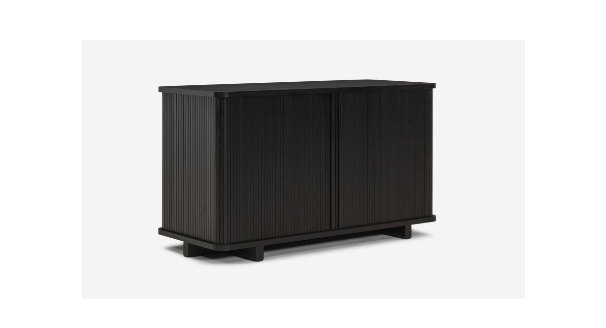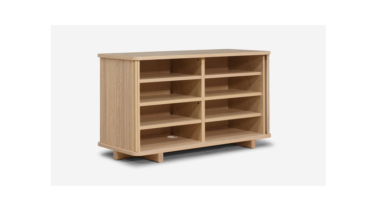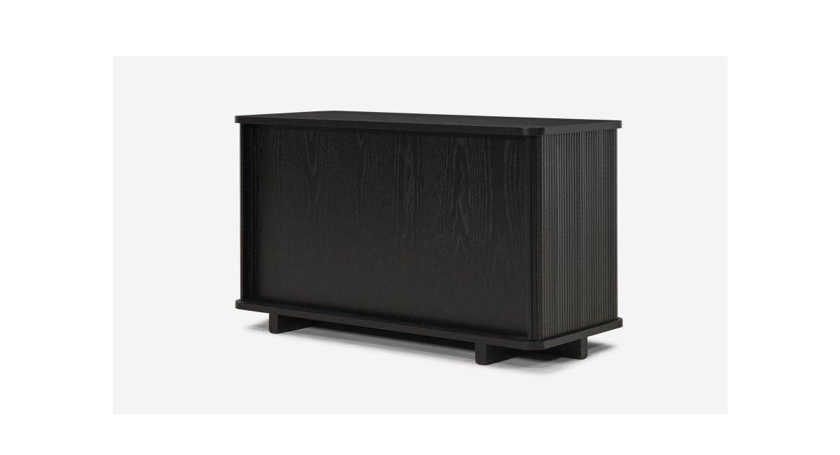 The EQ3 Tambour 42" Credenza. Inspired by the iconic roll-top desks of the 19th century, this credenza brings history into the present with a sleek, modern twist. Crafted from solid American ash, individual slats glide smoothly along a track, revealing a capacious interior that seamlessly integrates with electronics—ideal for use as a media unit.