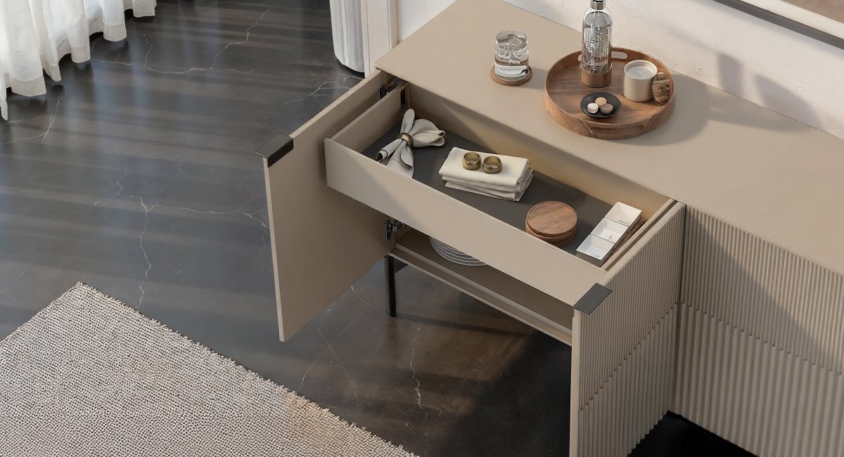 The Zig 7649 Storage Credenza, designed by Matthew Weatherly. This beautiful piece features striking fluted doors that add architectural texture and a touch of sophistication to any room. Behind its streamlined exterior, you’ll discover a fully customizable interior with adjustable shelves and drawers, allowing you to organize your belongings exactly as you see fit. The Zig credenza is more than just a storage solution; it’s a refined design statement that effortlessly combines form and function to enhance your living space.