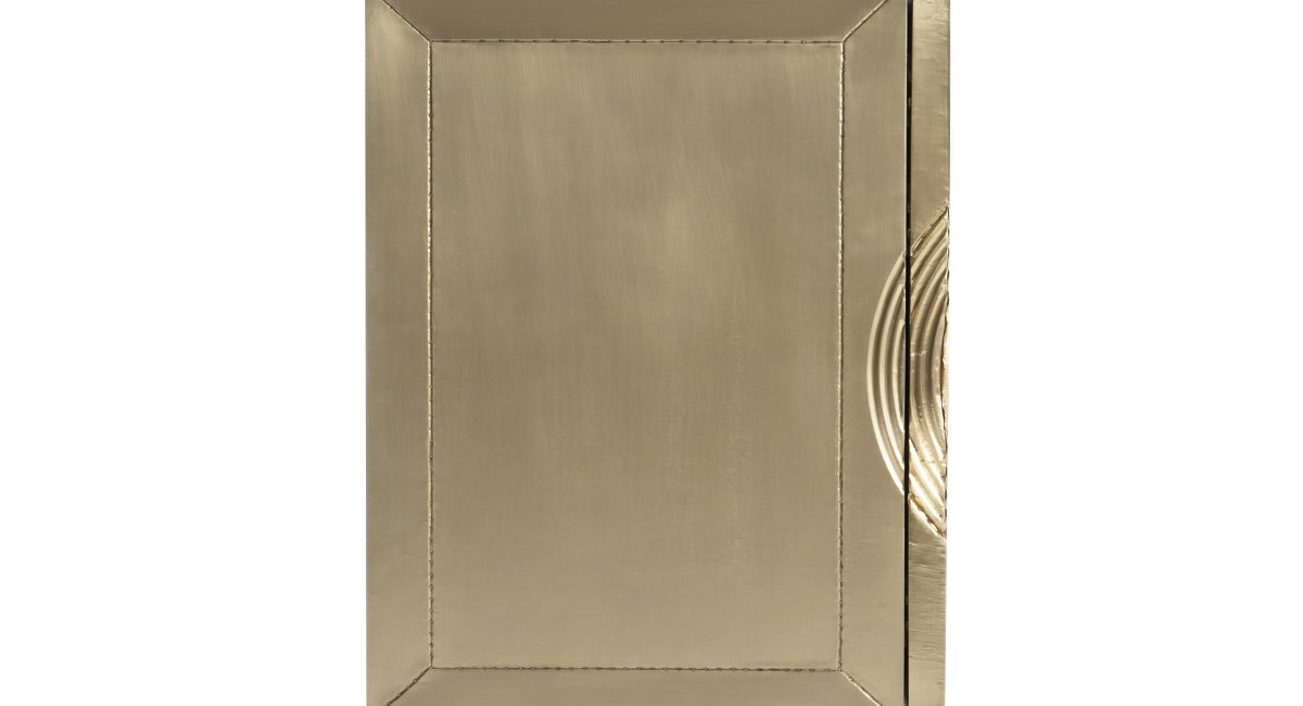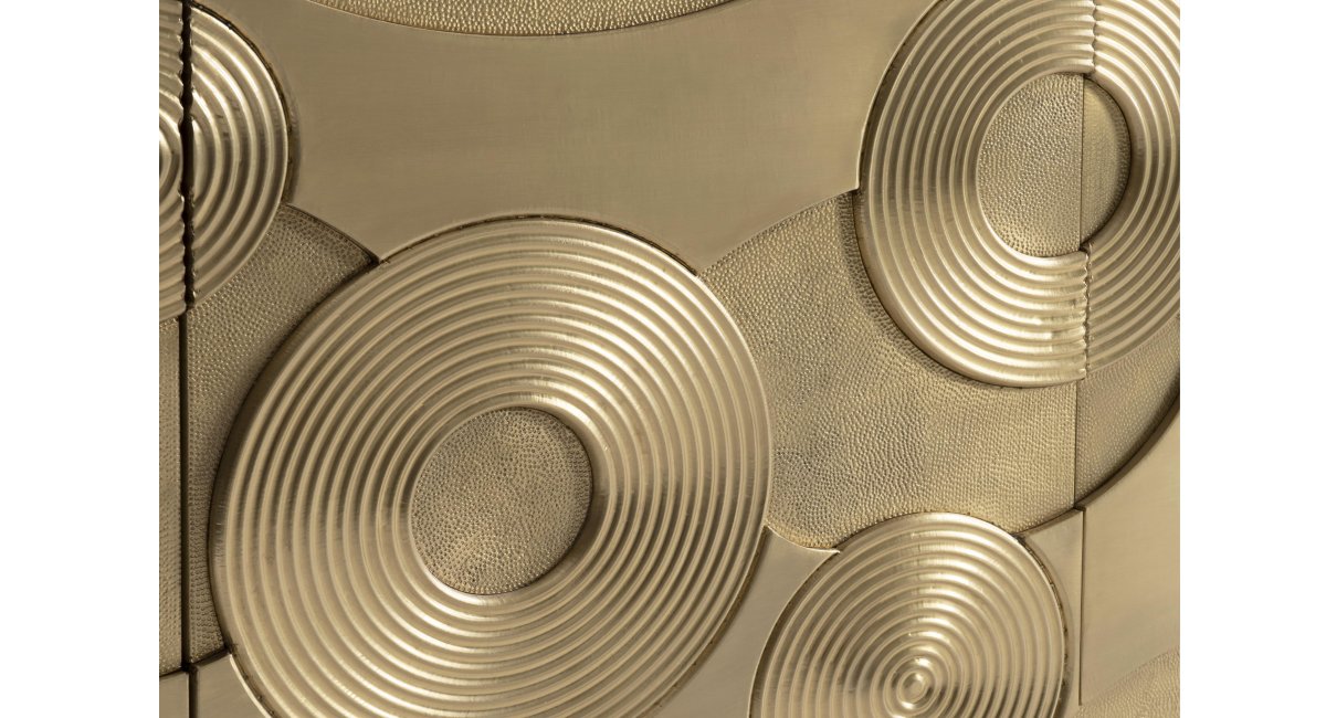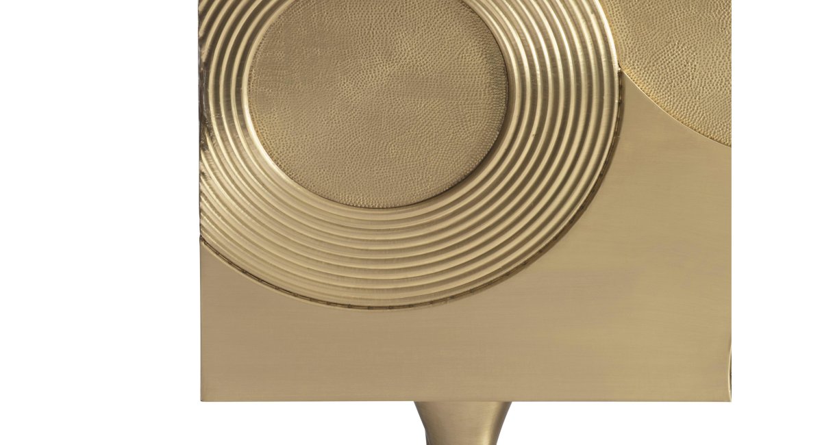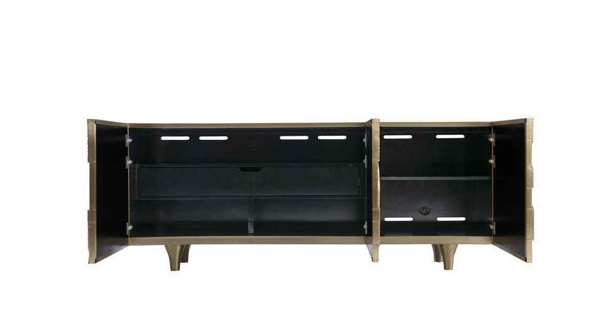 The Bernhardt Kintore Entertainment Credenza invites warmth and sophistication into your home. The exterior is fully clad in brass, featuring a stunning pattern of dimensional ripples and concentric circles that create a captivating visual texture. While the design is striking, the functionality is equally impressive, ensuring your living space remains organized and serene.