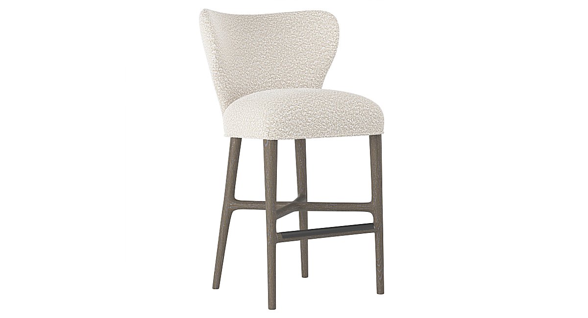 The Bernhardt Kemp Fabric Stool. A classic wingback chair is reimagined for a more modern style in the Kemp bar stool. The fully upholstered seat is supported by a wire-brushed wood frame that is available in three finishes: Midnight Black, Weathered Greige and Glacier White. Available as a Counter, or Barstool.