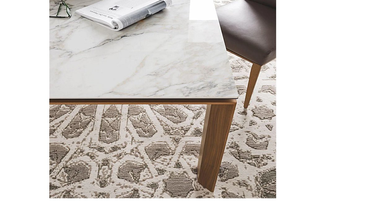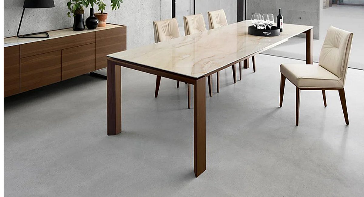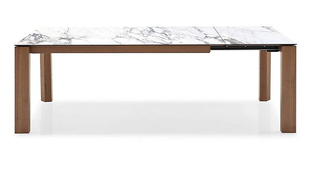 The Calligaris Omnia Extendable Dining Table. The table can comfortably seat up to 10 people, and features wooden legs and a glass, wood, or ceramic-stone top. The distinctive look of the table comes from the top, which appears to be suspended above the wooden frame. The legs extend on one side, allowing you to easily lift the extension leaf into place. The Calligaris Omnia Table is available in a wide range of sizes and finishes, so you can find the perfect one for your home. The Omnia is available in three sizes.