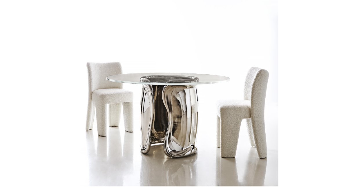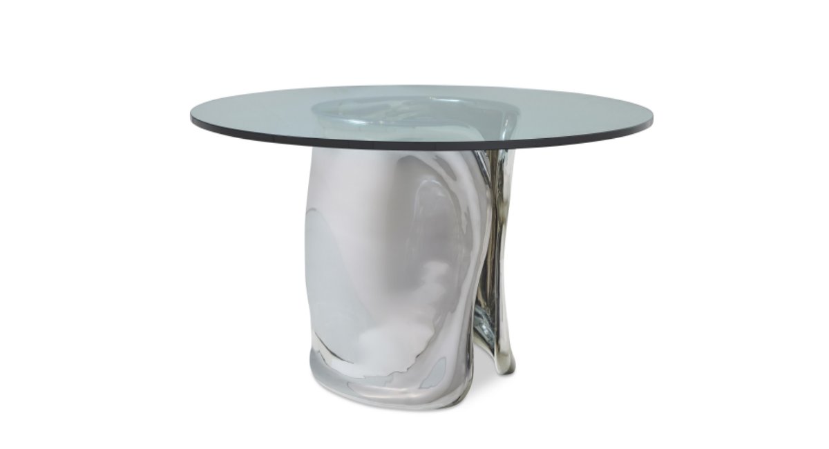 60" round glass top on sculpted cast metal base in Polished Stainless Steel finish.