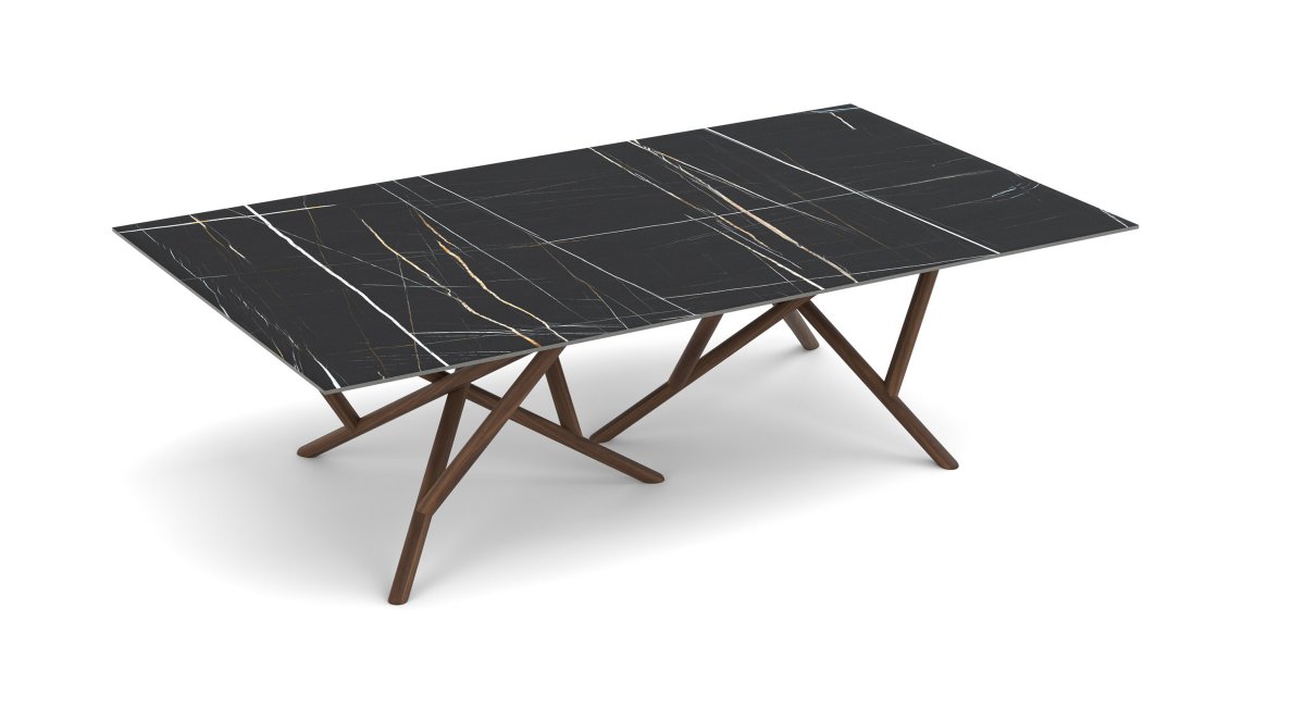 The Baton base is crafted in your choice of solid American black walnut, cherry, or oak hardwood, and is available in a variety of finishes. The finish is GREENGUARD Certified for low chemical emissions, ensuring a healthier environment for your home. The table is topped with a durable 12mm sintered stone surface. Choose from a Boat Top or Rectangular Top. The Sintered top is available in two colors, Sahara Noir, and Macchia Vecchia. 11 Finishes are available for solid hardwood tops versions.